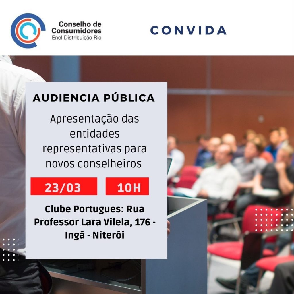 O Conselho de Consumidores da Enel Distribuição Rio promove nesta quarta-feira (23) às 10hs, no Clube Português, em Niterói, audiência pública para indicação das entidades representativas dos novos conselheiros da Enel Distribuição Rio. Os conselheiros são indicados por entidades representativas de cada classe de consumo como: Residencial, Comercial, Industrial, Rural e Poder Público, além de […]